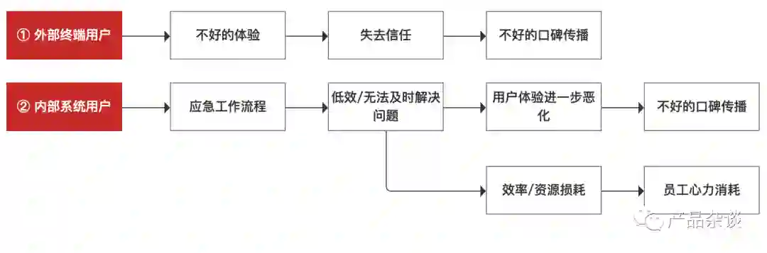以下,我们按照溢出的类型,把对象分成2类:外部终端用户(C/B用户)、内部系统用户(客服、售后、运营、线下作业人员等),来分别看下影响链。