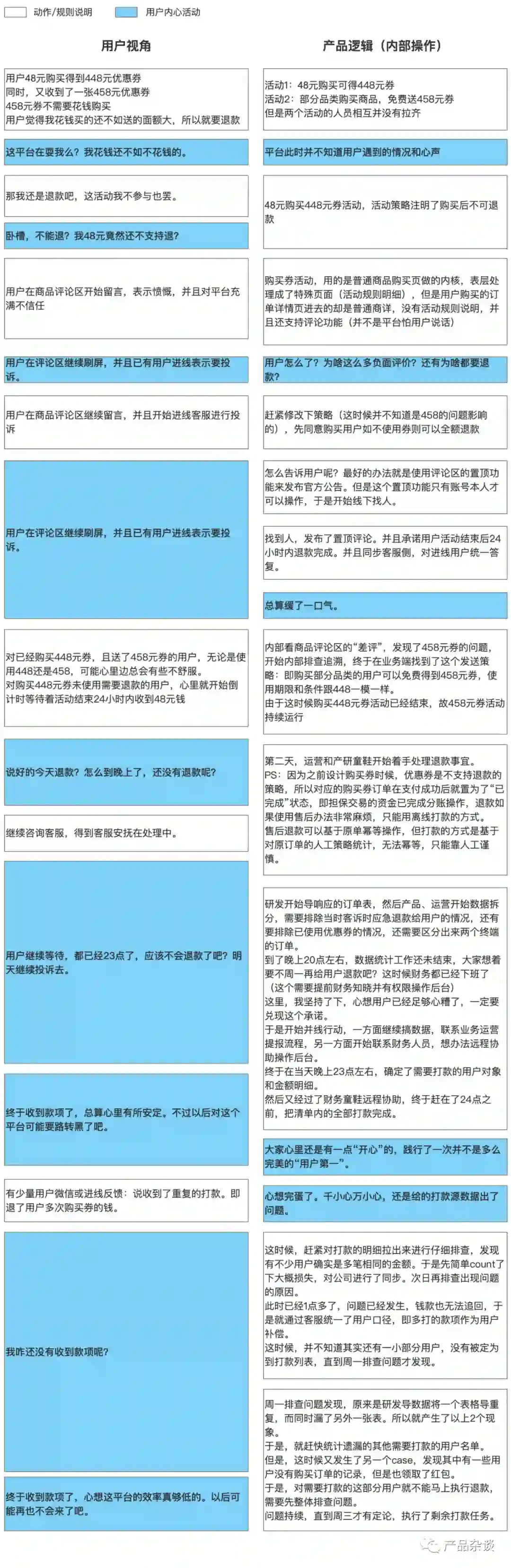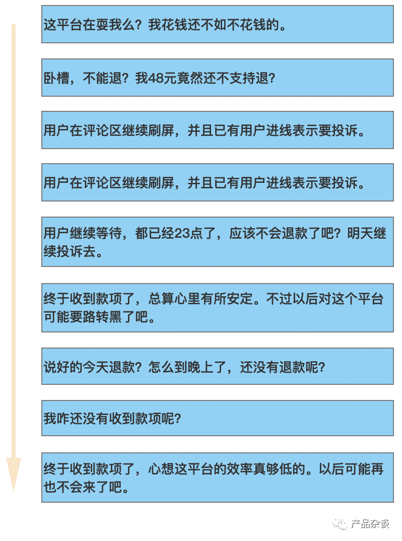 而实际上,真正评论、投诉的人占比肯定还是少的,背后那些没有发声的用户,其实内心活动应该也是如上图差不多。根据最终退款的人数,可能好几千的用户数,他们每一个都是有自己主见的个体,也都有信任体系和自己的口碑传播通道。