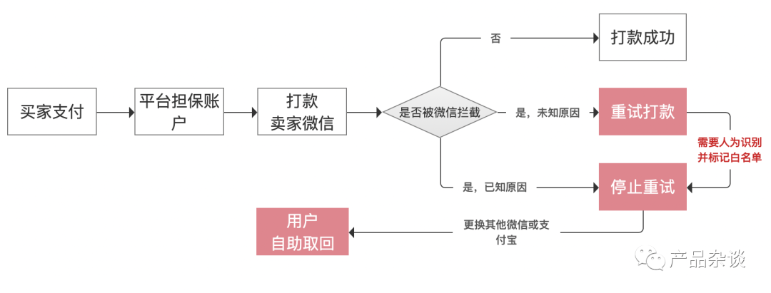 所以,我们只能定向解析出我们已知的拦截原因,停止重试打款,转到用户自助流程,引导用户更换打款方式/账号来提现。