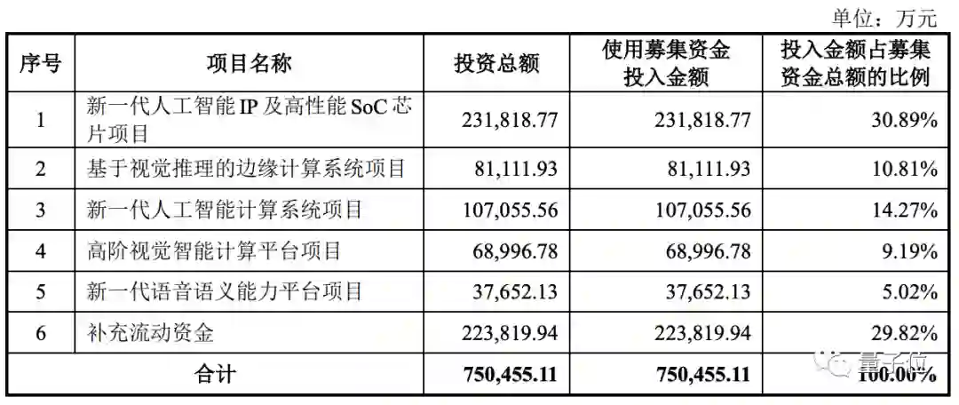 「新一代人工智能IP及高性能SoC芯片项目」、「新一代人工智能计算系统项目」,投入金额分别为23亿、10亿,占募集资金总额比例的30.89%、14.27%。