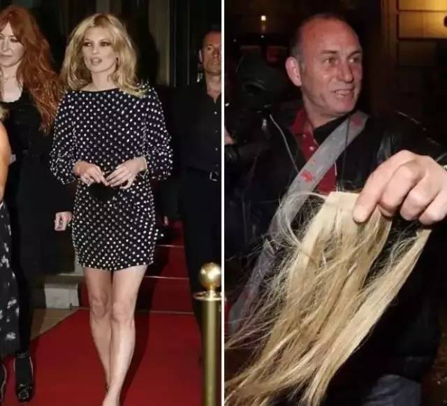 超模凯特·摩斯也遇到过假发片当众掉落的糗事,跟拍的狗仔大叔表示捡到宝了。
