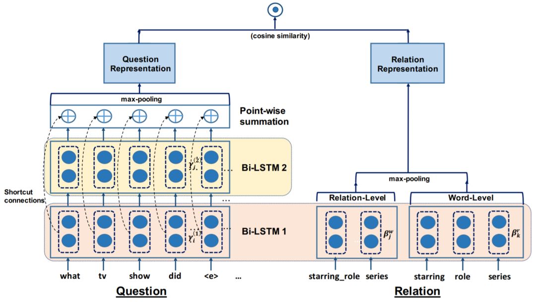 最新的自动问答模型广泛使用了深度学习技术。相关研究的共同点在于遵循一种 “编码—比较”框架,其重点在于,通过神经网络的特征学习能力,对问句和解析结构分别进行编码,得到各自向量表示,最后计算向量之间的相似度,代表问句与解析结构的匹配程度。以简单问题数据集SimpQuestions 为代表的问答模型几乎完全属于这一范畴, 由于在 SimpleQuestions 中,问句的语义解析结构均为单一谓词序列,因此这些模型本质上都是对文本序列和谓词序列之间的匹配进行建模。Yu 等人[49] 提出的 HR-BiLSTM 模型利用循环神经网络进行建模,如图2–7所示,谓词序列输入分为两个粒度:以唯一编号表示的编号序列,以及将谓词名称相连的单词序列,分别通过双向 LSTM 层进行编码,问句文本的编码也利用了双向 LSTM 层,并使用多层间的残差连接方式进行编码,旨在让模型能同时捕捉单词粒度和问句整体粒度的语义信号。SimpleQuestions上的其它类似模型还包括文献[48,50,92,93]。