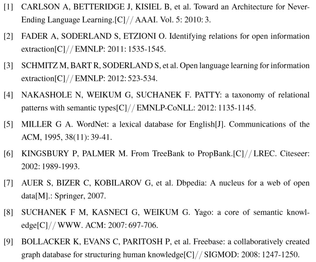 分别代表关系 relation 的主语和宾语。例如可以从句子“ Mozart was born in Salzburg , but moved to Vienna in 1781 ”中抽取出两个三元组( Mozart , was born in , Salzburg )以及( Mozart , moved to, Vienna )。早期的信息抽取主要针对特定领域的文本数据,而近年来提出的开放领域信息抽取( Open Information Extraction,OpenIE )系统[1-4]则从不限定领域的海量文本中提取不同的二元关系。然而,关系三元组中的每一个成分为字符串,同义词和一词多义现象依然存在。为了消除歧义,计算机需要通过更加规范的方式,表示不同的实体、关系和具体的三元组,而不是只停留在字符串层面。