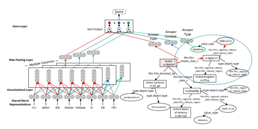 还有一些深度学习模型采用问句分别与答案相关的不同维度信息计算相似度,再将各个维度的相似度进行聚合,得到问句与候选答案的整体匹配度。Dong 等人[96] 提出了 MCCNN 模型,如图2–10所示,模型使用多个不同的卷积神经网络层对问句进行编码, 从而得到问句针对不同信息的向量表达。将它们分别与答案的类型、谓词、上下文向量表达计算相似度之后,最终的匹配度为这些相似度分值的总和,使得模型在寻找最佳答案时能兼顾来自不同方面的匹配特征。