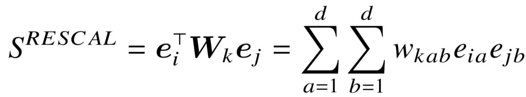 此外,Socher 等人还提出了较复杂的神经张量网络( Neural Tensor Networks,NTN ) 模型[81],可以看做是 RESCAL 和 E-MLP 的组合体,对实体对(,