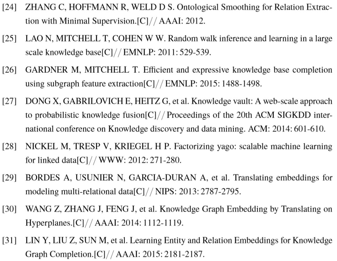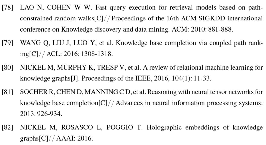 此外,还有其它 TransE 模型的改进工作,包括体现距离度量在不同特征维度间差异的TransA [85],生成谓词多个表示以解决一对多问题的TransG [32] 等,这里不再展开讨论。