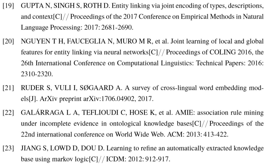作为自然语言理解中的基本任务,实体链接是一系列下游任务的前置步骤。首先,开放式信息抽取抽取的主谓宾三元组均为文本表示,通常具有歧义,一些研究工作旨在对三元组中的实体短语进行链接,代表文献包括[4,52],在实现三元组消歧的同时,结合知识库推理出主语和宾语所代表的类型,有助于挖掘不同谓词关系之间的语义联系。 其次,实体链接与知识库补全任务密切相关,该任务的目的是向已有知识库中补充新的事实三元组。这些新添加的三元组主要来源于两方面:随时间发展所产生的全新事实, 或基于已有知识的归纳推理。基于前者的补全依赖于信息抽取系统的不断挖掘,因此对主宾语的链接的准确率决定了知识库补全的效果。知识库补全的相关内容将在2.2节中论述。最后,对于自动问答任务,尤其是我们关注的基于知识库的事实类自动问答任务, 其描述的是与问句中实体相关的事实,因此不管以何种方式对答案进行建模,都依赖于对已有实体的准确定位,以限定问句对应语义的搜索范围。因此,实体链接的结果好坏,对这些任务的效果均有着很大程度的影响。