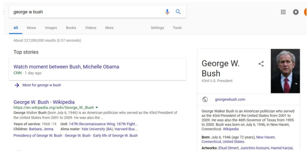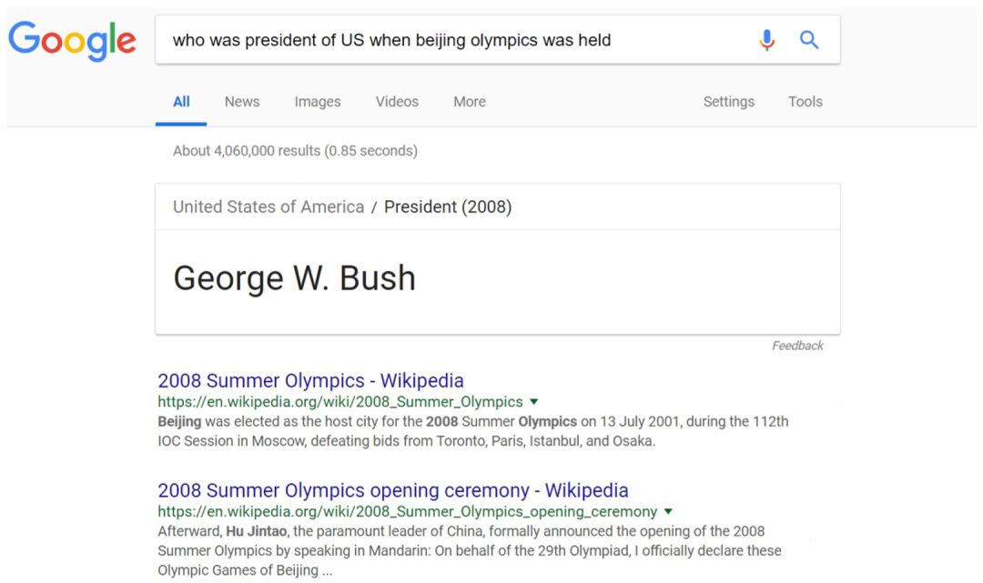 最后,对于句子的语义理解,为了能充分利用知识库的信息,我们关注描述客观事实的问句,通过自动问答任务衡量其语义理解能力。自动问答具有广泛的应用场景,搜索引擎便是其中之一。传统的搜索引擎工作方式依靠信息抽取相关算法,比较用户查询与网页的相似度,主要利用词级别的共现模型,如 TF-IDF [10],或词级别的语义匹配模型,如 LSI [11],pLSA [12] 等。但对于用户输入的复杂问题,词级别的匹配难以直接定位到用户想要的答案或网页。更加智能化的搜索引擎,则尝试对问题进行推理,并根据已有的知识库,将答案定位至已知的实体中。Google 建立了以 Freebase 为基础的知识库(Google Knowledge Graph),当用户搜索一些名词时,如图1–3中,用户搜索“george w bush” ,结果页面右侧会显示实体的信息框,包括其属性,以及与其关联的其它实体 等。而如图1–4所示,当用户输入较为复杂的问题 “ who was president of US when beijing olympics was held ”,搜索引擎能在结果页面上方显示出自动回答的结果。对比下方的传统页面搜索结果可见,精确返回答案能大大提升查询过程的用户体验。