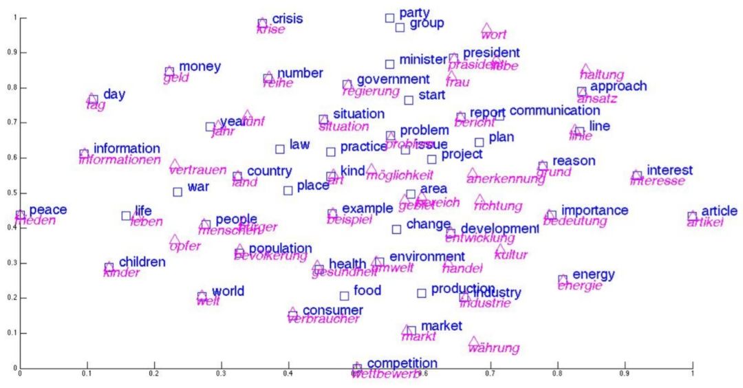 上一节的论述中提到了词向量模型,用于学习词汇的连续语义表示,但仅局限于单一语言。对于涉及多个语言的任务,难点在于如何实现语义的跨语言过渡。为了解决此问题,跨语言词向量模型(Cross-Lingual Embedding Model )旨在消除单词语义表示对语言的依赖,将不同语言的向量表示映射至同一连续空间,并依旧保持相似语义单词更加接近的特性,以此实现语义迁移。例如图2–4展示了一个英语和德语之间的共享语义 空间,可以清晰地识别出两种语言间的许多组翻译词对。