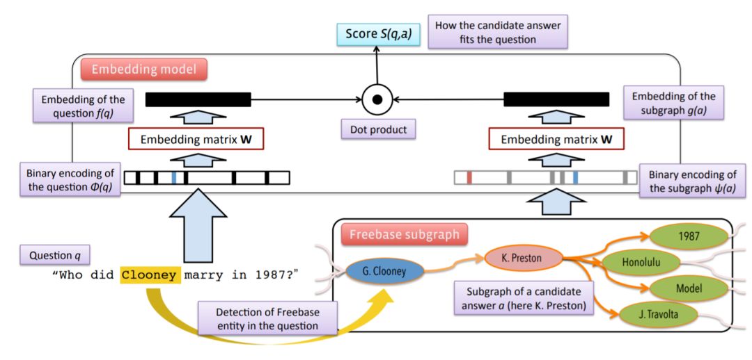 的每一行对应一个元素(词、实体、类型、谓词)的向量表示,因此该模型实现了词向量和知识库向量的联合建模。