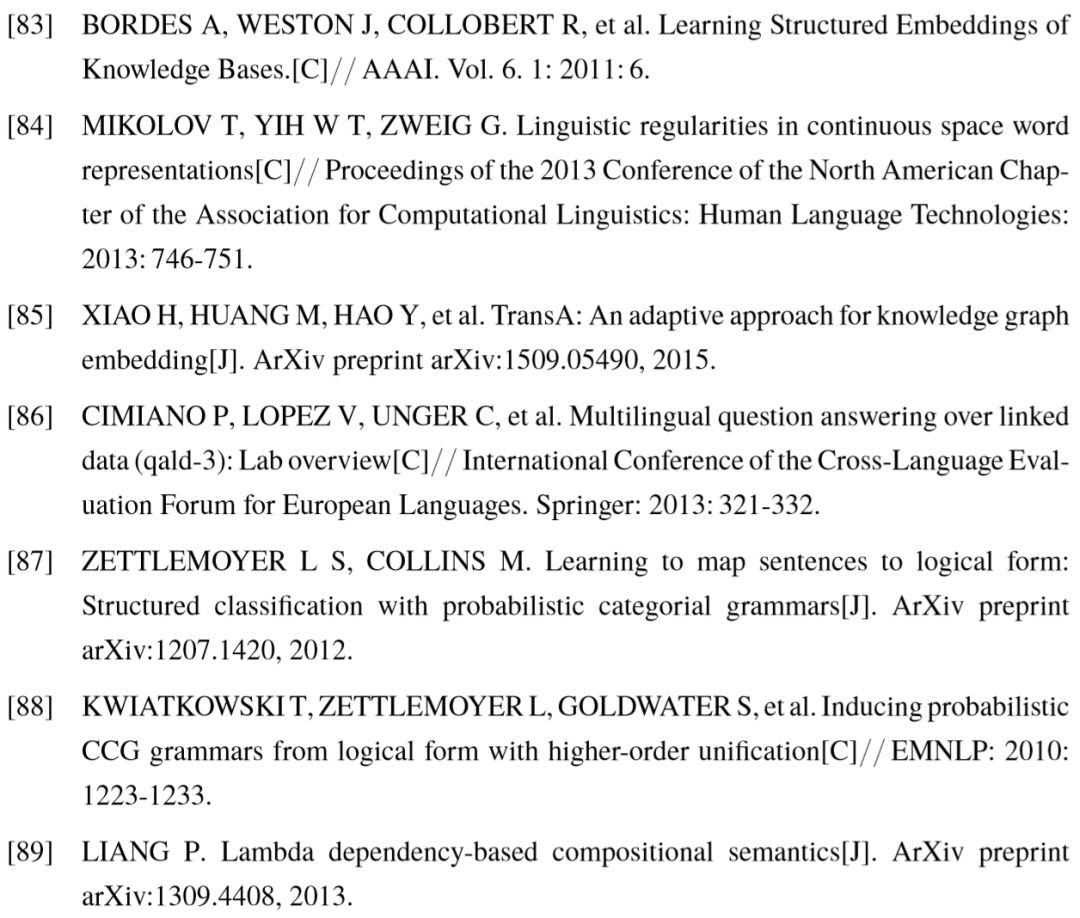 综上所述,本文从实体、关系、问句三个粒度出发,研究自然语言和知识库之间的语义理解与匹配问题。在实体理解中,我们提出了基于神经网络、跨语言词向量以及联合训练的链接模型,并用于解决跨语言场景中对表格文本进行的实体链接问题。对关系和问句的语义理解,我们始终贯彻语义建模的可解释性,使用主宾语类型搭配描述关系具有的多义性,以及使用基于知识库的图结构描述关系或问句的精确语义。对于自动问答任务,我们提出的深度学习模型实现了对复杂图结构的整体建模,得以充分体现其特征学习能力,更有效地度量问句与复杂结构的语义匹配程度。最后,希望本文的一系列工作能够对该领域今后的学术研究有所帮助。