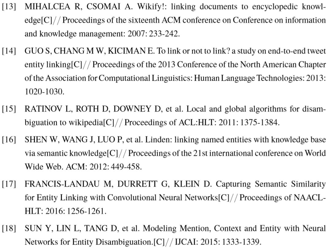 在这类方法中,一个候选实体所具有的特征可以分为三类:先验特征,上下文语义特征,以及与句中其它实体的关联特征。先验特征与短语所处的文本无关,仅基于短语与候选实体在维基百科中的统计信息,主要体现为短语所在锚文本链接至该实体的概率,以及实体出现在不同维基页面中的概率。上下文语义特征关注文本及目标实体的语义近似程度,利用词袋模型( Bag-of-Words )将短语的上下文以及目标实体的维基页面分别转化为向量形式,通过 TF-IDF 得到不同词语的重要性,并用向量间的相似度代表语义匹配程度。实体间的关联特征体现在不同短语所对应的实体之间,它们维基百科页面的相关性有助于实体链接的判断。在维基百科中,若两个实体同时指向的页面较多, 或同时指向这两个实体页面的其它实体较多,则它们具有较高的相关度。常用的计算方式主要为点对点互信息( PMI )[15] 或基于谷歌距离的维基链接度量( WLM )[16]。其它的可选方式包括 Jaccard 相似度,以及具有非对称形式的条件概率。