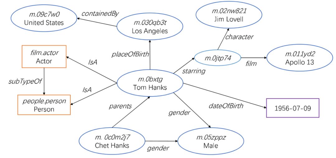 具有代表性的知识库包括 DBPedia[7],YAGO[8] 和 Freebase[9],它们皆诞生于 2007 年。DBPedia的构建过程基于对维基中的信息表格、页面分类、外部链接等半结构化信息进行自动抽取,可以看作是最纯粹的结构化维基百科;YAGO 的主要信息同样来自对 Infobox 内容的自动抽取,同时将页面分类信息与 WordNet 严谨的概念层次关系进行融合,构建出代表实体类型的层次关系;由 MetaWeb 公司开发的 Freebase 集成了维基百 科、IMDb 、MusicBrainz 等多个数据库的知识,并提供接口,允许用户对 Freebase 的结构化内容进行编辑或添加新的知识,因此相比其余知识库,Freebase 具有更大的规模。这些结构化知识库的共同点在于使用资源描述框架(Resource Description Framework),每一条知识都由SPO 三元组表示,即( subject , predicate , object )形式,其中 subject 和 object 为知识库中的节点,代表着不同的实体、类型或属性值,predicate 为连接不同节点的边,代表实体间的关系,或实体的属性,统称为谓词。在知识库中,不同的节点和边具有独立的编号,因此不具有歧义。为了与 OpenIE 的关系三元组区分,我们将知识库里的 SPO 结构称为事实三元组。这些知识库内的所有事实三元组构成了庞大的图结构,即“知识图谱’’名称的由来。