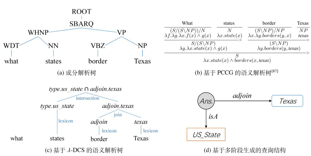 仍以 “what state borders texas” 为例,不同研究工作中的结构化语义形式并不相同, 但本质都为公式2–12所描述的逻辑表达式。图2–6列出了一些典型工作生成的解析结构。