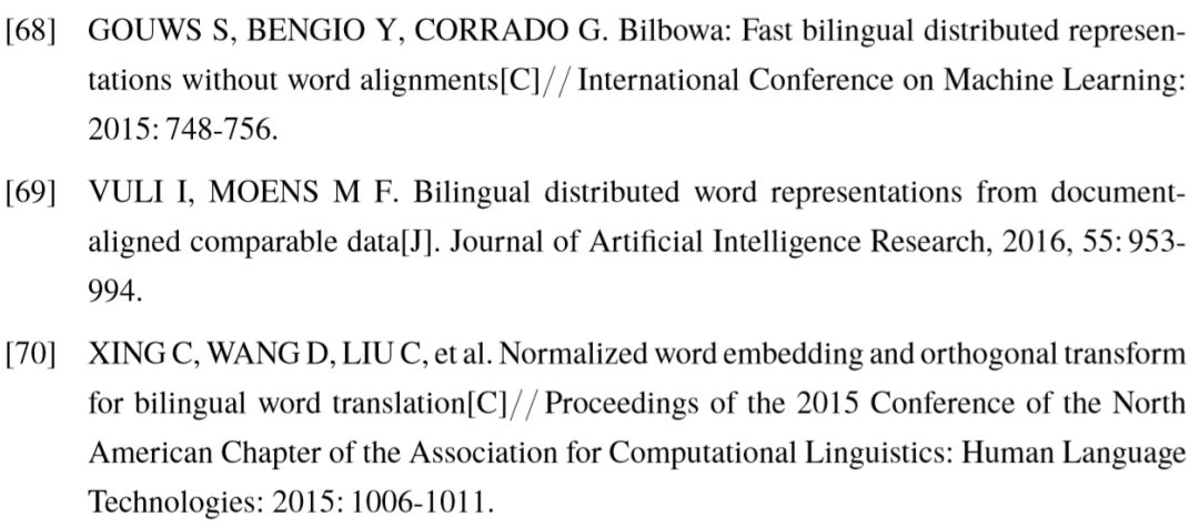 基于线性映射的跨语言词向量模型具有一些变种,例如文献 [70, 71] 限制转移矩阵 为单位正交阵,以保证映射后的词向量维持单位长度,Artetxe 等人[72] 指出,对于模型效果而言,转移矩阵正交化比向量正则化更加重要。Lazaridou 等人[66] 对