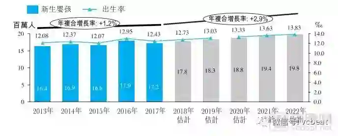 中国政策上近年逐步放宽计划生育政策。新生婴孩数目已由2013年的1640 万人增至2017年的1720 万人,期间年复合增长率为1.2%,出生率由12.08‰ 增至12.43‰。根据沙利文报告,未来数年的出生率预计将稳步增至13‰ 以上。