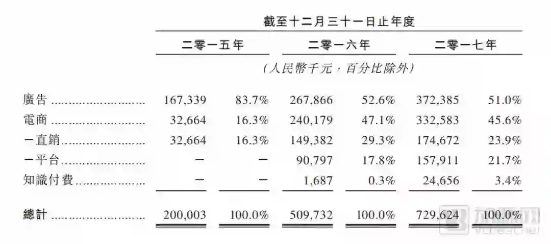 2017年营收7.29亿元,广告和电商为主要收入来源