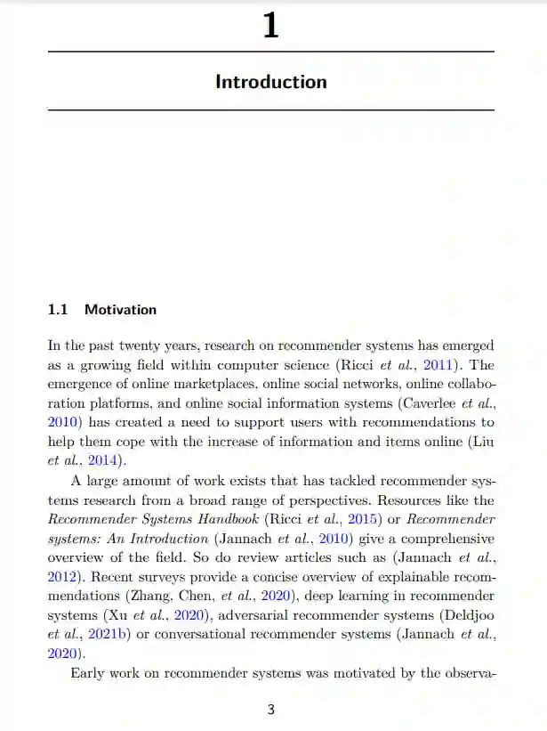 在过去的二十年中,推荐系统的研究已经成为计算机科学中的一个新兴领域(Ricci et al., 2011)。在线市场、在线社交网络、在线协作平台和在线社交信息系统(Caverlee et al., 2010)的出现,催生了为用户提供推荐的需求,以帮助他们应对在线信息和商品的增加(Liu et al., 2014)。大量的工作已经从广泛的角度解决了推荐系统的研究。推荐系统手册(Ricci et al., 2015)或推荐系统简介(Jannach et al., 2010)等资源提供了该领域的全面概述。评论文章(Jannach et al., 2012)也是如此。最近的调查提供了可解释推荐(Zhang, Chen et al.,2020年)、推荐系统中的深度学习(Xu et al.,2020年)、对对抗推荐系统(Deldjoo et al.,2021b)或对话推荐系统(Jannach et al.,2020年)的简明概述。
