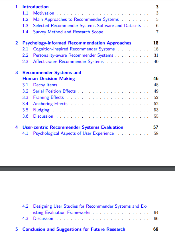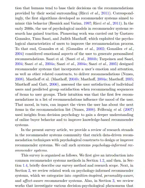 推荐系统的早期工作是受到这样一种观察的启发,即人类倾向于根据其社会环境提供的推荐做出决策(Ricci et al,2011)。相应地,作为推荐系统开发的第一个算法旨在模仿这种行为(Resnick和Varian, 1997;Ricci et al,2011)。在21世纪初,心理学模型在推荐系统研究中的应用得到了广泛的关注。Gustavo Gonzalez, Timo Saari和Judith Masthoff进行了开创性的工作,他们利用用户的心理特征来改进推荐过程。为此,Gonzales等人(González et al,2002;González et al., 2004)考虑用户的情感方面来生成个性化的推荐。Saari等人(Saari et al., 2004b; Turpeinen和Saari, 2004;Saari et al,2004a;Saari et al,2004a;Saari et al., 2005)设计的推荐系统结合了用户的情感和注意力,以及其他相关的结构,以提供推荐(Nunes, 2008)。Masthoff等人(Masthoff, 2004b;Masthoff, 2004;Masthoff, 2005;Masthoff and Gatt, 2006),评估了个体用户的用户满意度,并预测了向用户组推荐项目序列时的群体满意度。他们的直觉是,推荐列表中的前几个推荐会影响用户的情绪。这种情绪反过来又会影响用户对推荐列表中下一个项目的看法(Nunes, 2008)。Felfernig等人(2007)利用决策心理学的见解对在线买家行为进行了更深入的理解,并改进了基于知识的推荐系统。
