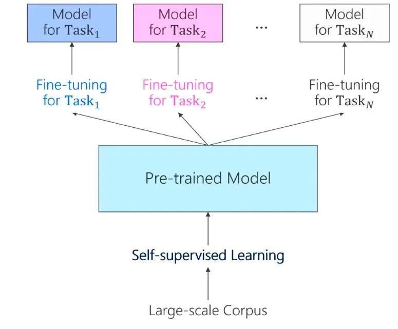 。对大型数据库做 Self-supervised learning,针对大规模语料进行训练,可以得到预训练模型。