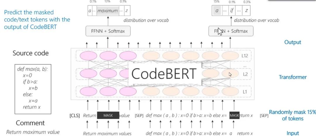 CodeBERT是一个可处理双模态数据的新预训练模型,使用了 Transformer 作为基本网络结构,采用混合目标函数:掩码语言模型和替换 Token 检测。
