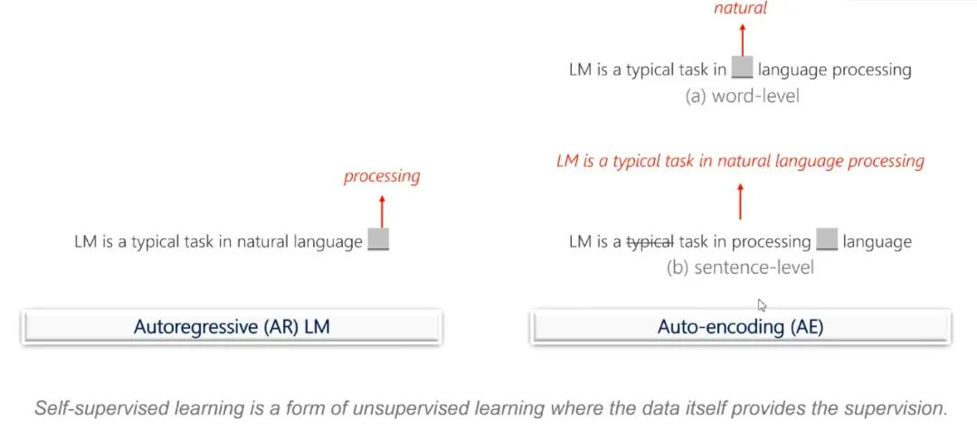 在Pre-trained model中,需要一个自监督学习策略 Autoregressive language model (自回归语言模型)和 Auto encoder (解码自动编码器)做单语言、多语言或多模态,支持多种自然语言任务,包括分类、序列标注、结构预测、序列生成。