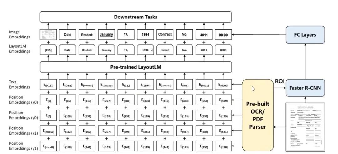 用 OCR 扫描文档,扫描结果加每一个识别对象的位置信息作为输入,得到 OCR 的结果,每个结果的位置信息和对应文档的预训练模型,使用时,将预训练模型加图像的部分融入,做各项文档识别和信息抽取的任务。