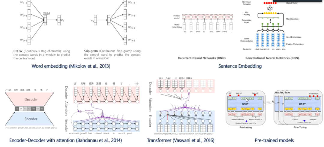 包括 Word embeddings、LSTM、Encode decoder、RNN、Pre-trainedmodel 等,这些技术推动了自然语言的应用,包括基于神经网络的机器翻译,预训练模型演化,阅读理解技术等。