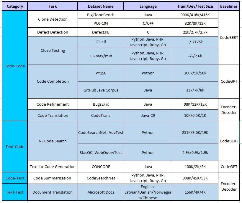为了支持代码智能的研究,研究人员发布了数据集 CodeXGLUE。该数据集包括14个子数据集,用于10个多样化的代码智能任务,包括 Code-Code、Text-Code、Code-Text 和Text-Text 四大类。