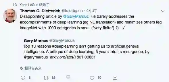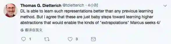 但跟Marcus同为纽约大学教授的Yann LeCun却不以为然,就在刚才,他转发了前美国人工智能协会主席Thomas G. Dietterich反驳Gary Marcus的推文,以表达观点。