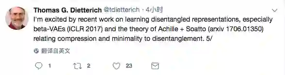 “对于最近解体表征方面的学习进展,我感到非常兴奋,特别是ICLR 2017上的beta-VAE,还有Achille和Soatto关于压缩与极小解缠的理论。5/”