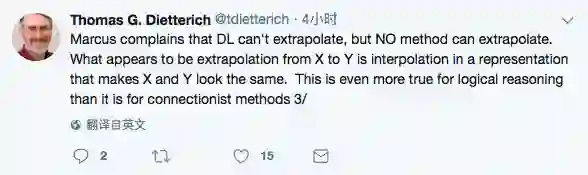 “Marcus抱怨深度学习无法进行推理,但目前无论哪种人工智能也都做不了推理。从X到Y的推理过程,实质上更像是从X和Y的表示中找到使其看起来相同的插值。对于逻辑推理来说,这比起联结主义的方法更真实。3/”