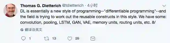 “深度学习本质上是一种新的编程形式,即“可微分编程”,且该领域正在以这种新的形式来创造一种可复用结构。我们已有的结构包括:卷积、池化、LSTM、GAN、VAE、记忆单元、路由单元,等等。8/”