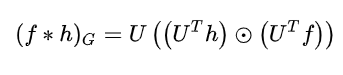 由上面可知, 和卷积核 的傅里叶变换结果 和 (均为列向量), 和 的卷积为 其分别傅里叶变换后的乘积的逆变换, 故Graph卷积公式为如下: