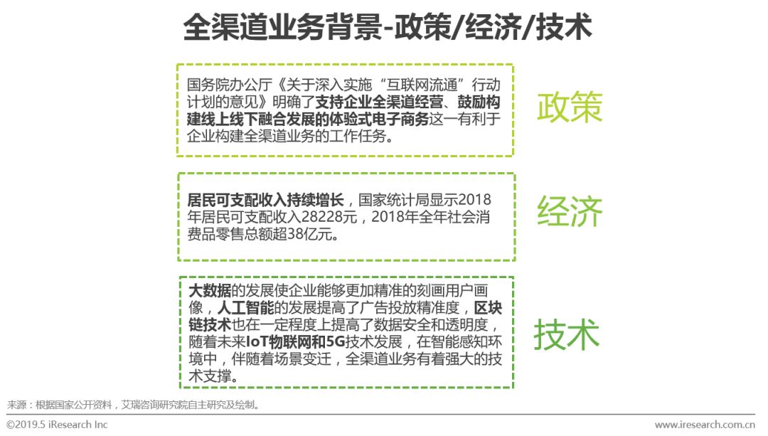 背景:政策、经济、技术为品牌商发展全渠道打造良好环境,消费习惯与人口特征共同要求全渠道业务发展