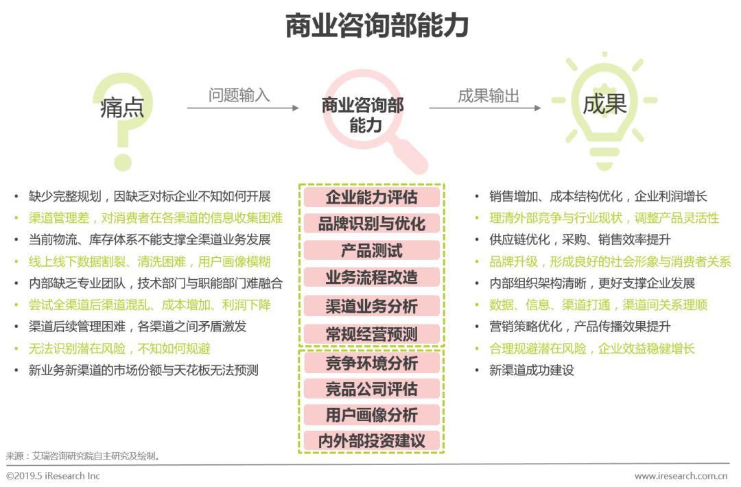 艾瑞商业咨询拥有全球的专家资源和先进的咨询经验,旨在利用自身内外部能力解决企业的商业问题,提出定制化的解决方案并付诸实施,最终将管理方法与知识赋能于企业的决策,成就企业长效、可持续发展。