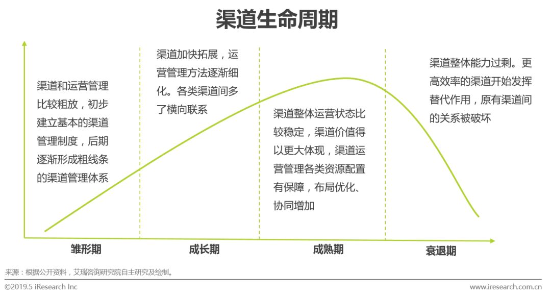 渠道的生命周期分为四个阶段,分别是建设期、成长期、成熟期和衰退期。在建设初期,渠道和运营都比较粗放;成长期则加快渠道拓展,运营管理更加精细化;成熟期的渠道则比较稳定,价值得到更好的体现;处于衰退期的渠道,将被替代。鉴于不同渠道可能处于不同阶段、同一个渠道在不同地区也有不同的发展,在全渠道业务的布局过程中,艾瑞商业咨询可通过渠道生命周期定位矩阵为企业判断某渠道目前所处的生命周期及其效率,为企业新增或优化现有渠道提出建议。