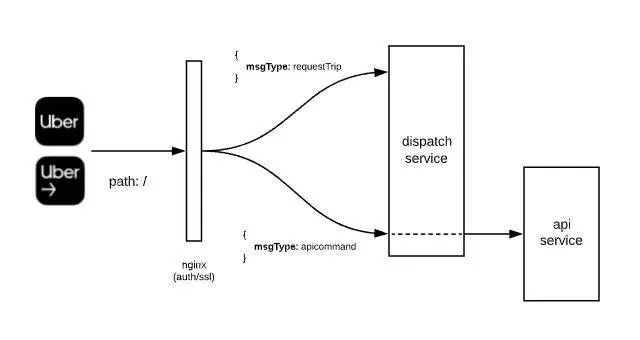 乘客应用程序和司机应用程序都使用位于“/”的单一终结点连接调度服务。端点的主体有一个名为“messageType”的特殊字段,该字段决定了调用特定处理程序的 RPC 命令。该处理程序以 JSON 有效负荷进行响应。