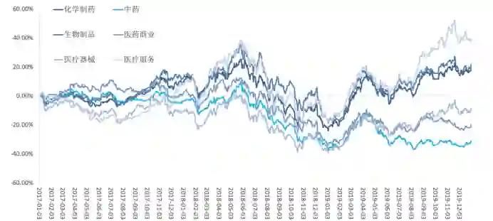 再看医药板块内部子行业间的分化,以申万II级分类为准,相比于化药、生物制品、医药商业、医疗器械、医疗服务这五大子行业都有相应的利多因素支撑业绩,中药在那些年间却是预期总体偏空,因此也就成了子行业分化中表现最差的那一个。