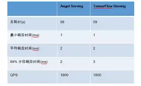 表 3 展示了 Angel Serving 和 TensorFlow Serving 性能对比结果,我们使用具有 100 万个特征的 DeepFM 模型,向服务发送 100,000 个预测请求。Angel Serving 和 TensorFlow Serving 的总耗时分别为 56 秒和 59 秒。两个服务系统的平均响应时间都为 2 毫秒。Angel Serving 的 QPS 是 1,900,而 TensorFlow Serving 的 QPS 是 1,800。