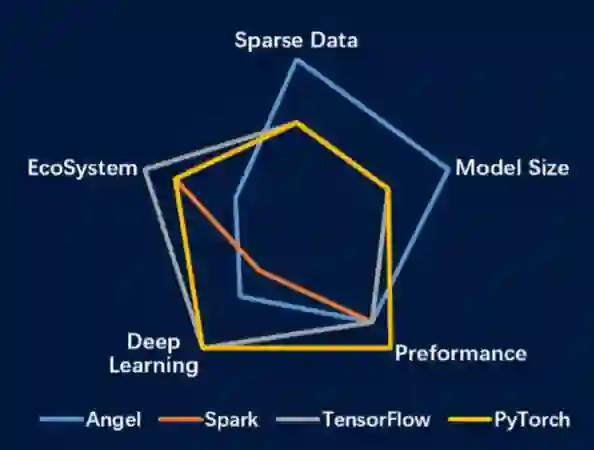 相比之下,Angel 更擅长于推荐模型和图网络模型相关领域(如图 1 所示),与 Tensorflow 和 PyTouch 的性能形成互补。