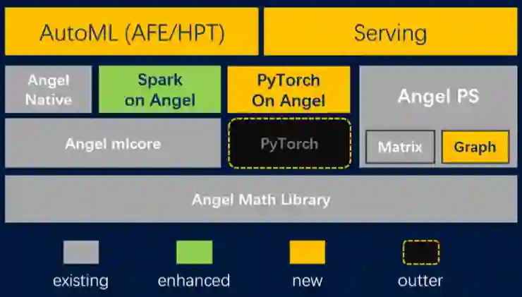 除此之外,Angel 3.0 中还集成了 PyTorch 来作为计算引擎。目前它支持 3 种计算框架:原生的 Angel,Spark On Angel(SONA)和 PyTorch On Angel(PyTONA),这些计算框架可以使得 Spark 和 PyTorch 用户能够灵活切换到 Angel 平台。最上层包括了两个公共组件:AutoML 和模型服务。