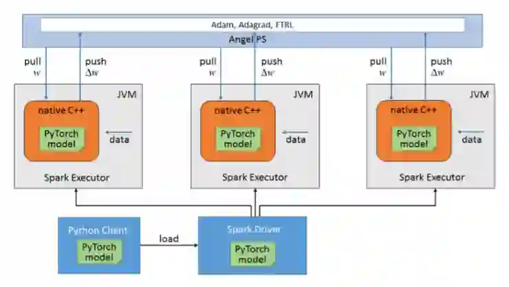 Spark Worker:读取计算数据,同时从 PS 上拉取模型参数和网络结构等信息,然后将这些训练数据参数和网络结构传给 PyTorch,PyTorch 负责具体的计算并且返回梯度,最后 Spark Worker 将梯度推送到 PS 更新模型。