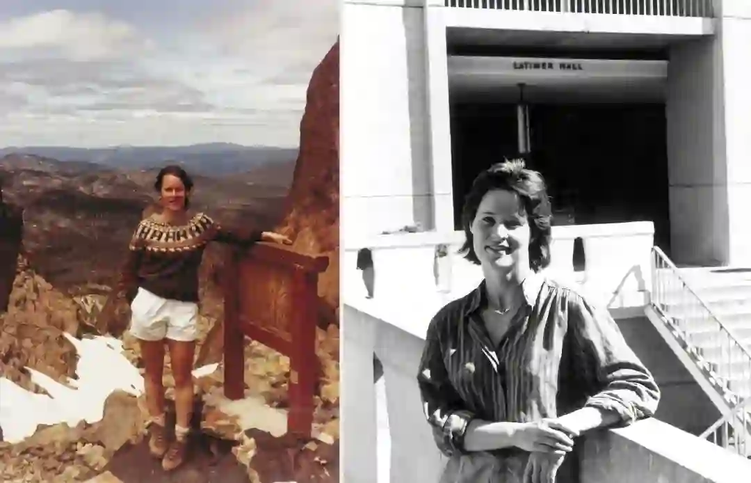 (左)1982 年:弗朗西斯·阿诺德在国王峡谷国家公园徒步旅行;(右)1983 年:弗朗西斯·阿诺德在加州大学伯克利分校化学学院拉蒂默大厅前。(照片由 Francis H. Arnold 博士提供)