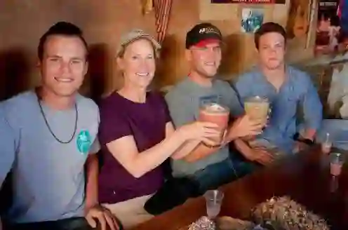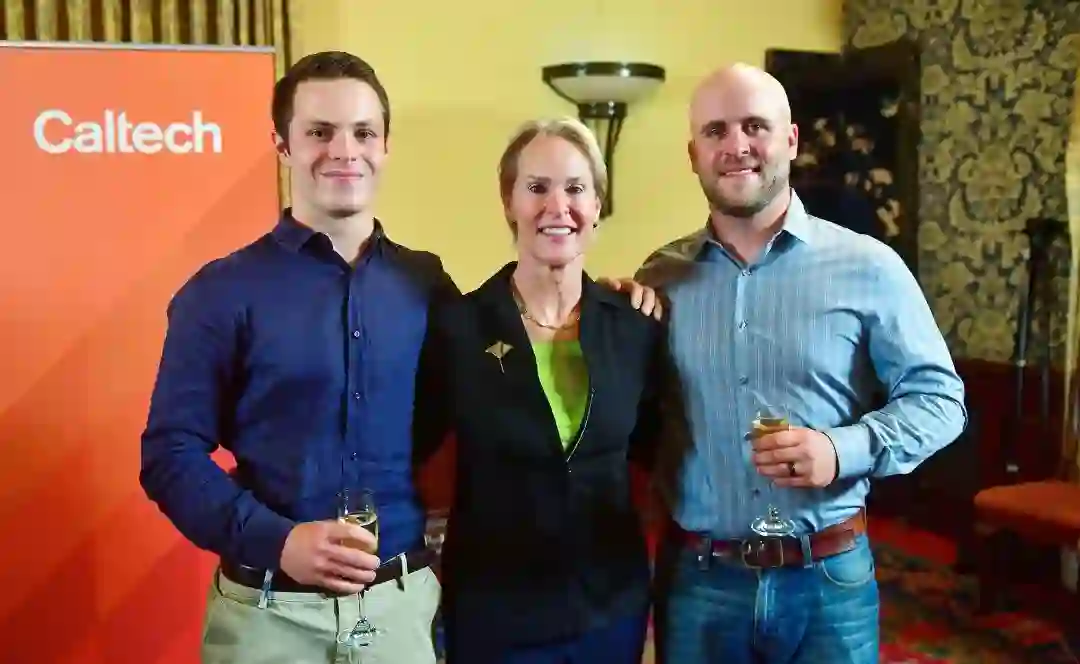 2018 年 10 月 3 日:弗朗西斯·阿诺德和她的儿子约瑟夫·兰格(左)和詹姆斯·贝利(右)在加利福尼亚州帕萨迪纳市的加州理工学院,在新闻宣布她获得诺贝尔化学奖后。阿诺德与美国的乔治·P·史密斯和英国的格雷戈里·P·温特爵士一起获得了诺贝尔化学奖。(Frederic J. Brown and Getty)