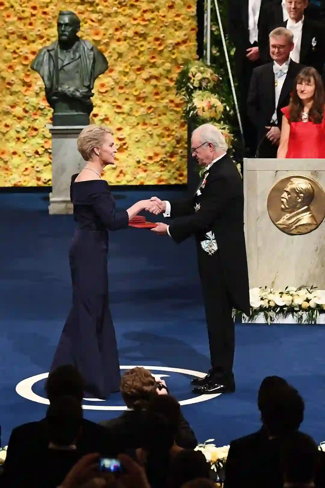 2018 年 12 月 10 日:2018 年诺贝尔化学奖获得者美国化学工程师弗朗西斯·阿诺德博士在瑞典斯德哥尔摩音乐厅的颁奖典礼上从瑞典国王卡尔十六世·古斯塔夫手中接过诺贝尔奖。瑞典皇家科学院将 2018 年诺贝尔化学奖的一半授予阿诺德博士,以表彰她对“酶的定向进化”的贡献。(Photo by Jonathan Nackstrand and Getty Images)