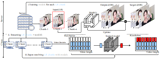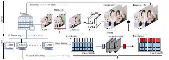 互联网视频在过去几年发生了爆发式增长,这给视频传输基础设施带来了巨大的负担。网络视频传输系统的质量很大程度上取决于网络带宽。受客户端 / 服务器日益增长的计算能力和深度学习的最新进展的启发,一些工作提出将深度神经网络 (DNN) 应用于视频传输系统的工作,以提高视频传输质量。这些 DNN 的方法将一整个视频平均分成一些视频段,然后传输低分辨率的视频段和其对应的 context-aware 模型到客户端,客户端用这些训练好的模型推理对应的低分辨率视频段。通过这种方式,可以在有限的互联网带宽下获得更好的用户体验质量 (QoE)。其中,传输一段长视频需要同时传输多个超分辨率模型。
