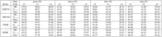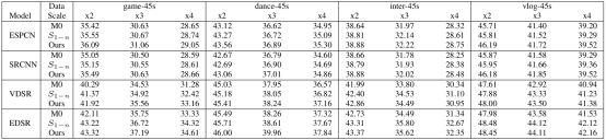 根据上表可以清晰地看到,在不同的视频和超分尺度上该方法 (Ours) 不仅可以追赶上训练 n 个模型 (S1-n) 的精度,并且可以在峰值信噪比上实现精度超越。注:M0 表示不对长视频进行分段,在整段视频上只训练一个模型。