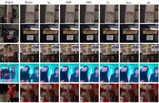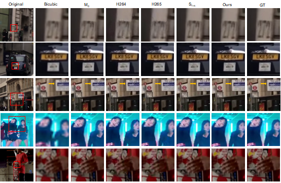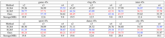 该部分实验对本文提出的方法和传统 codec 方法 (调低码率做压缩) 进行了定量比较。根据上表可以清晰地看到 (红色表示第一名,蓝色表示第二名),在相同的传输大小下(Storage),该方法(Ours) 在大多数情况下可以超越 H264 和 H265。同时视频的长度越长,SR 模型所占传输大小的比例越小,该方法的优势越明显。