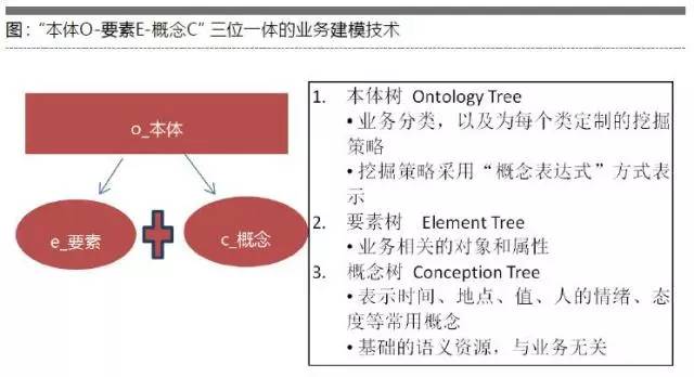 INDO-OEC业务建模,能把纷繁复杂的业务规则和灵活多样的语言表达习惯进行统一建模,从本体、要素和概念三个维度构建分析挖掘模型,有效地将“业务”描述与自然语言的表达进行分离,使得业务人员可以专注于自己擅长的业务需求及业务规则的建模,而无需考虑自然语言的歧义性、表达的多样性和复杂性等。